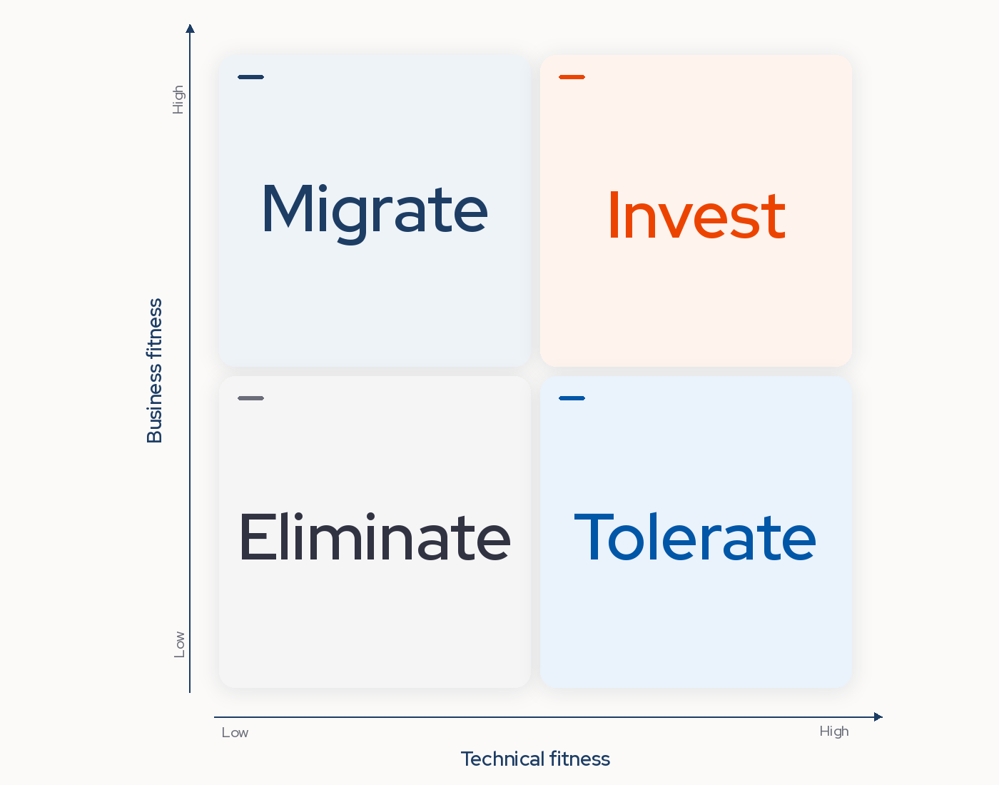 Applications are typically evaluated across business fitness (how well the app supports business outcomes) and technical fitness (how healthy the underlying system is), then classified into one of four categories: