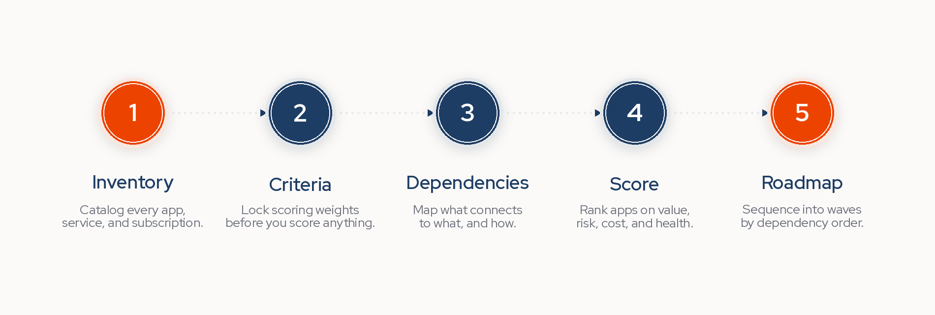 Assessments usually run in waves. A first-pass triage scores 100 to 500 apps on a handful of attributes in days. A deeper assessment then examines 10 to 50 high-priority candidates across a dozen or more dimensions. Both feed the same roadmap.
