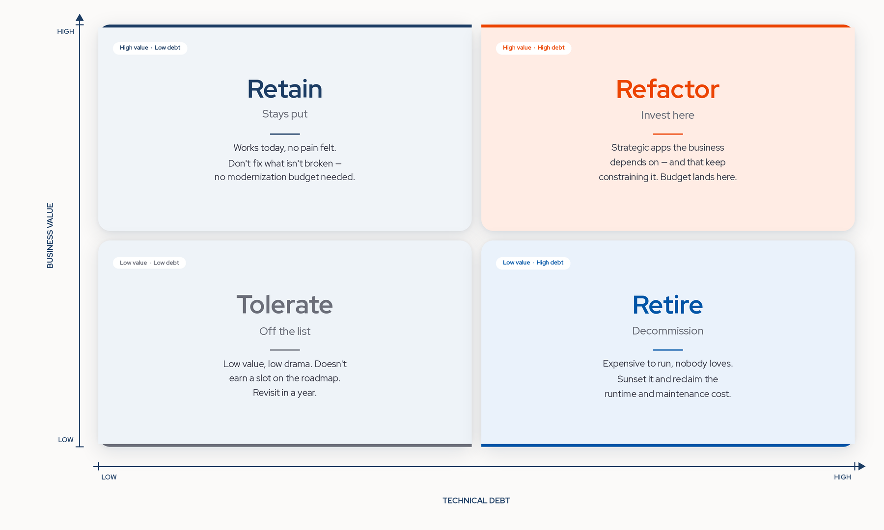 Each application needs a two-dimensional score: business value (does this thing matter?) and technical condition (is this thing hurting?). Cross-tab those into a simple 2×2, and the modernization priorities fall out. High-value + high-debt wins the Refactor budget. Low-value + high-debt gets Retired. High-value + low-debt stays put. Low-value + low-debt stays off the list.