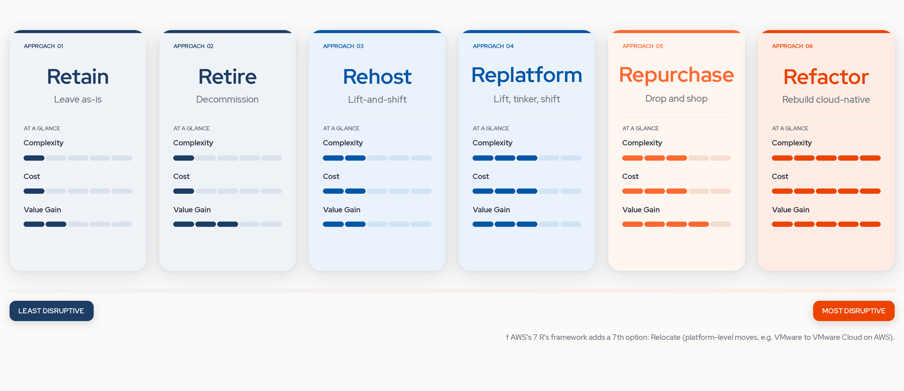 Every serious application modernization strategy rests on the same core framework: the 6 R's. Originally coined in the context of cloud migration and expanded by AWS to 7 R's with the addition of Relocate, it's the default lens for picking an approach per application.