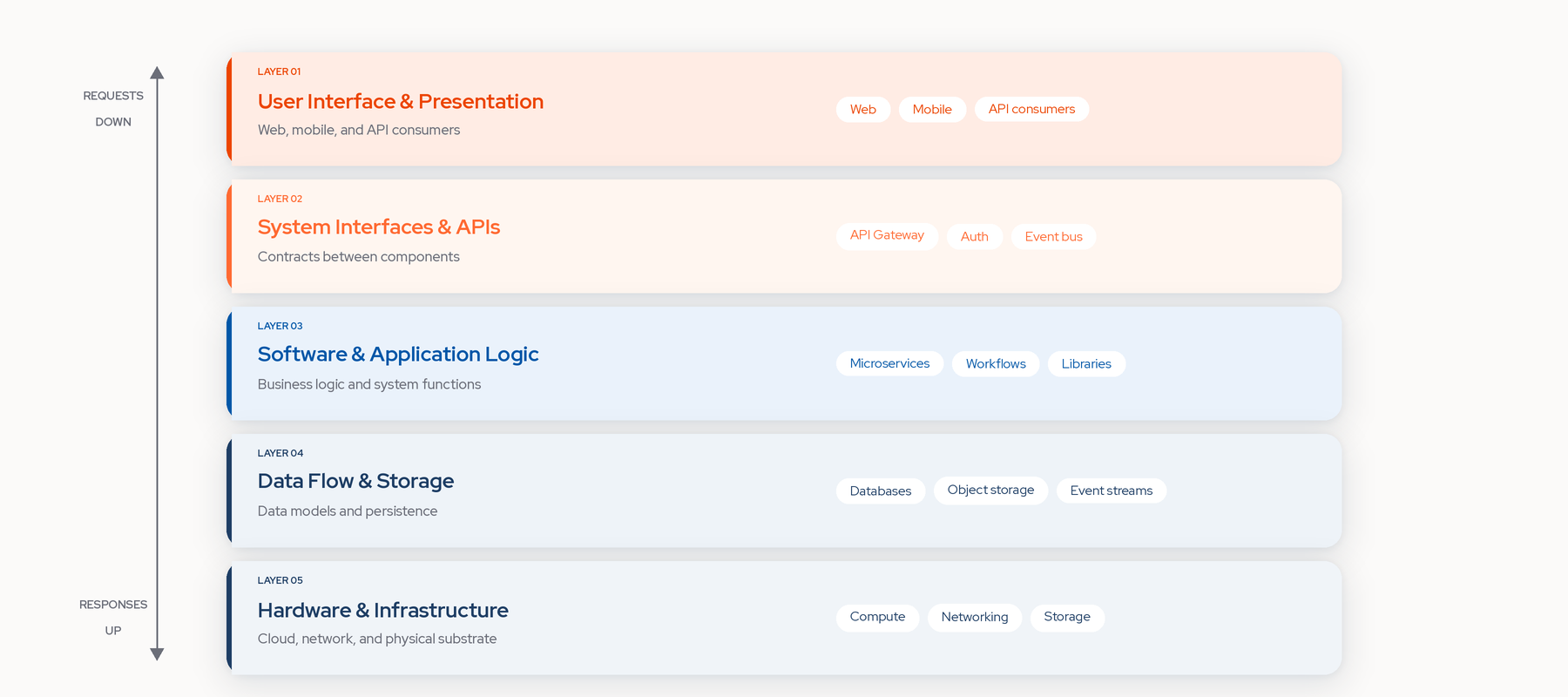 The physical and virtual substrate on which the system runs. Servers, storage devices, networking, and, for most modern software systems, cloud services that abstract all of it. Cloud-native infrastructure uses managed services for elasticity, with infrastructure defined as code and autoscaled on demand. The cloud provider and underlying tech stacks become part of the overall system structure, not just hosting details.