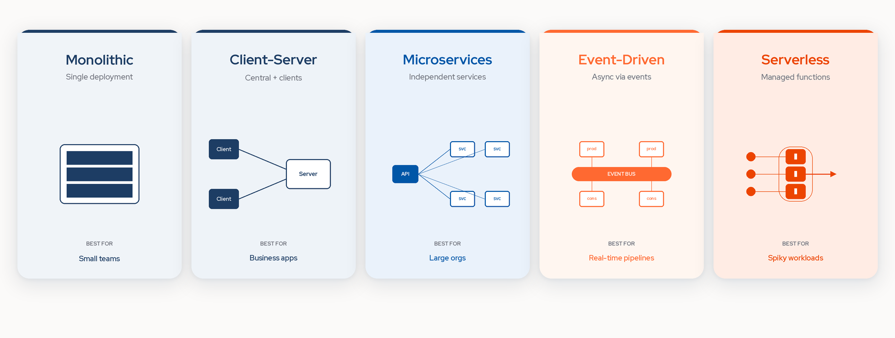 The style you pick shapes almost every future decision. There's no universally best choice, only the right fit for your team size, workload, and operational maturity. These are the patterns you'll see most often.