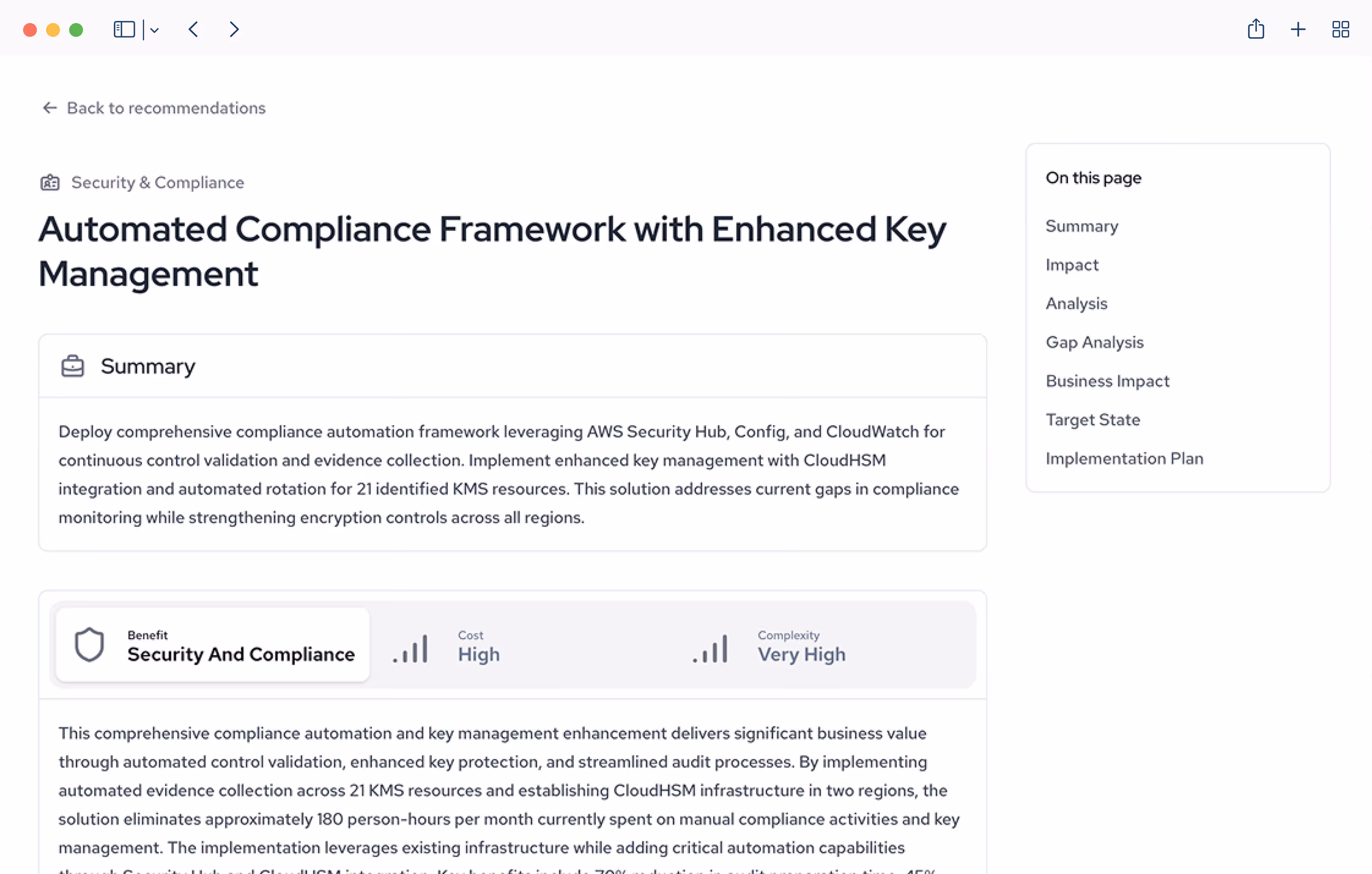 Each recommendation includes detailed cost, benefit, and implementation complexity so you can prioritize with real ROI insight. Every suggestion comes with rich, consultative reasoning that explains the "why," not just the "what.”